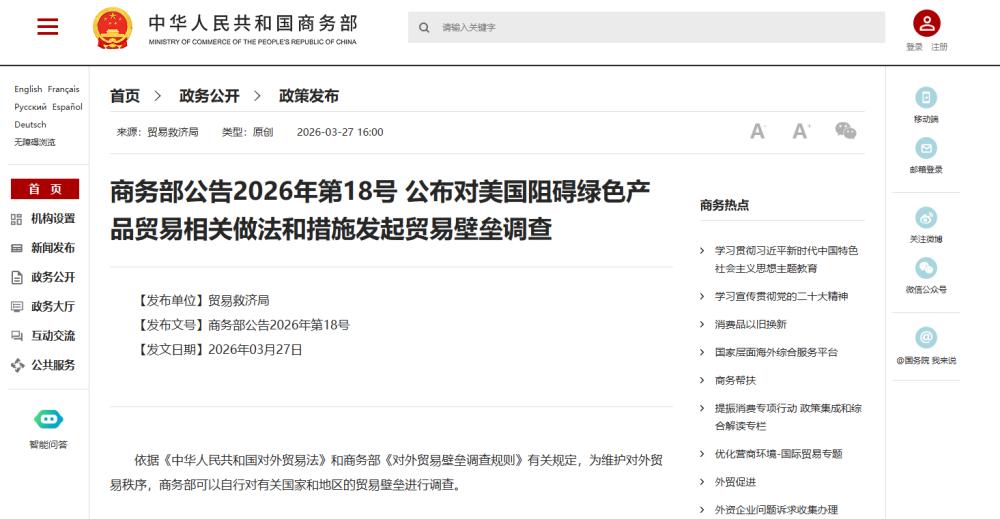 原标题:商务部公告2026年第18号 公布对美国阻碍绿色产品贸易相关做法和措施发起贸易壁垒调查