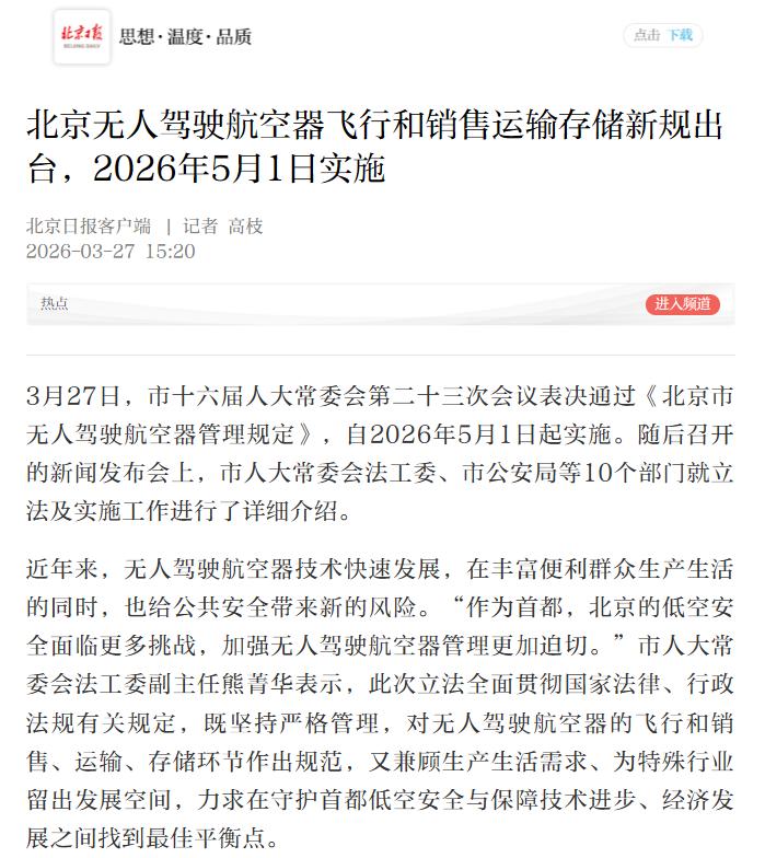 原标题:北京无人驾驶航空器飞行和销售运输存储新规出台,2026年5月1日实施