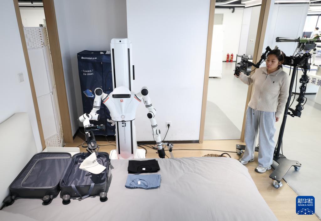 3月25日,在北京市石景山区首钢园内的人形机器人数据训练中心,工作人员在训练机器人。