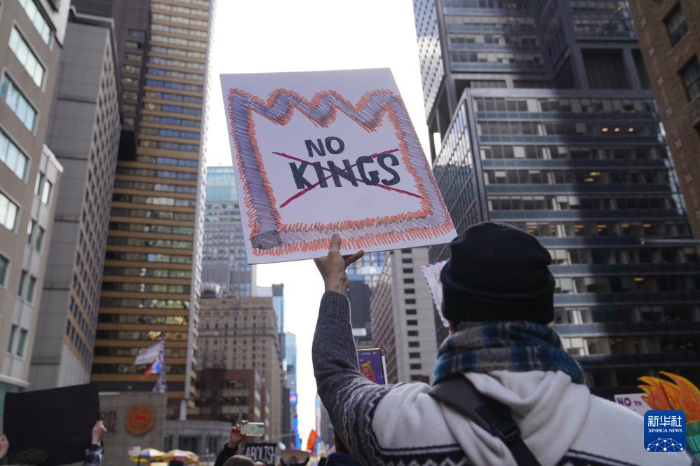 3月28日,在美国纽约,抗议者手举“不要国王”标语牌。