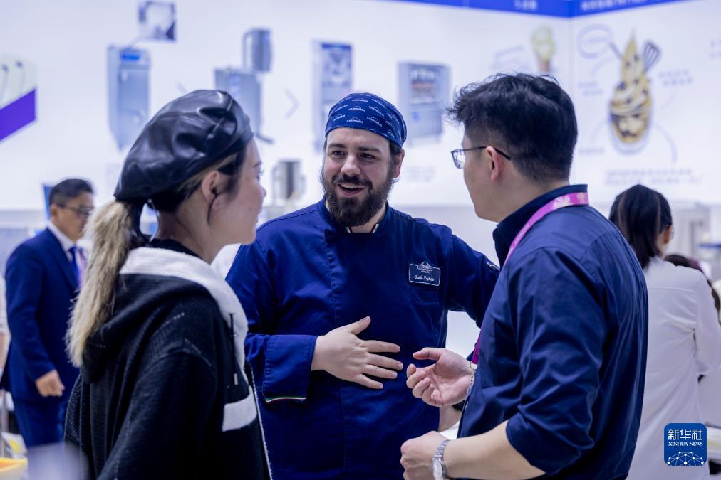 3月30日,外国展商在冰淇淋展区与观众交流。