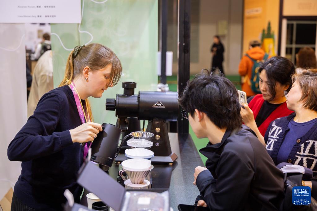 3月30日,观众在一家瑞典咖啡展位体验。