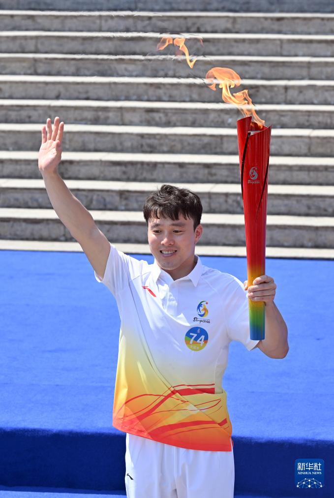 3月30日,火炬手邹敬园在火炬传递活动中。