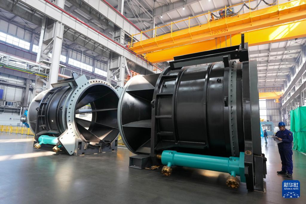 这是3月31日在哈电集团哈尔滨电机厂有限责任公司拍摄的该公司自主研制的巨型水电泄压阀。