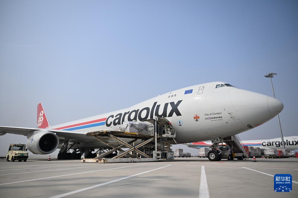 3月31日,在郑州新郑国际机场,一架卢森堡货航货机卸货完毕。