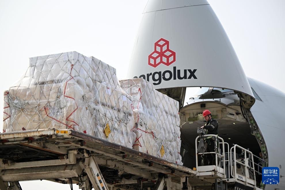 3月31日,工作人员在郑州新郑国际机场为一架卢森堡货航货机装货。