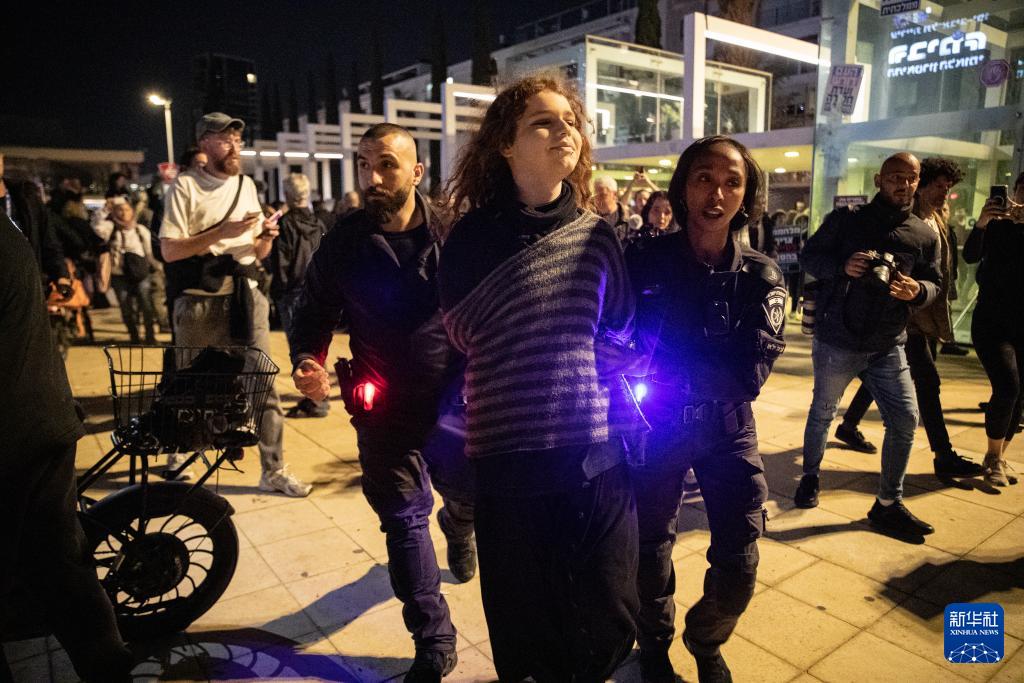3月28日,在以色列特拉维夫一处广场,一名参加反战集会的女子被警察带走。