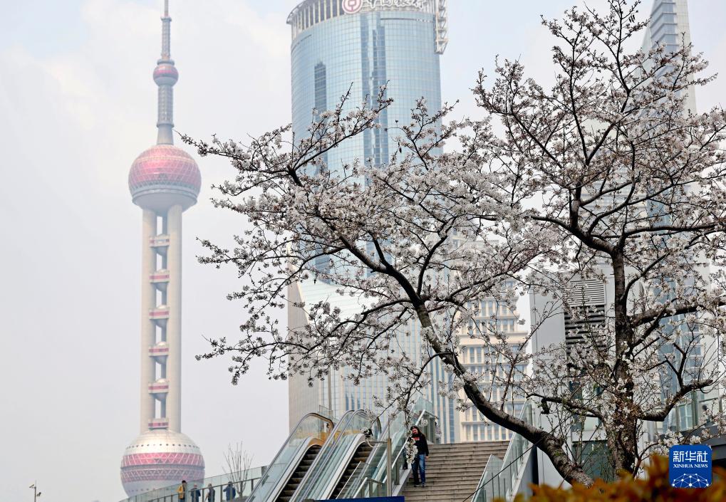 4月1日拍摄的樱花和上海东方明珠广播电视塔。