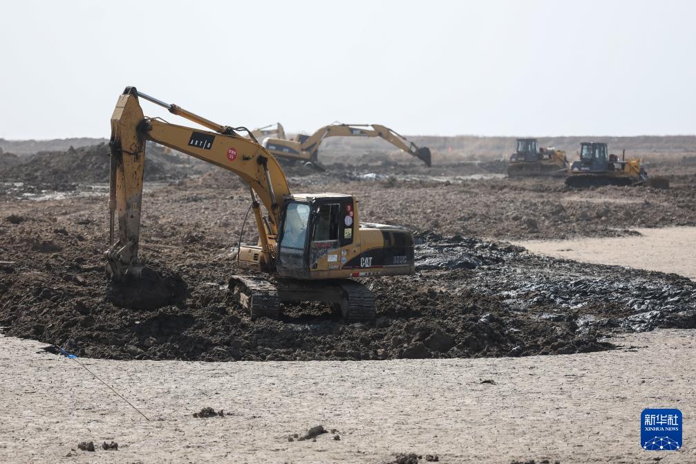 春日,在辽宁辽河口国家级自然保护区内,数台大型机械有序开展地形修复作业。这里是盘锦市海洋生态保护修复工程项目的施工现场。