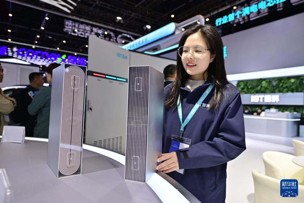 4月2日,工作人员在第十四届储能国际峰会暨展览会上介绍展品。