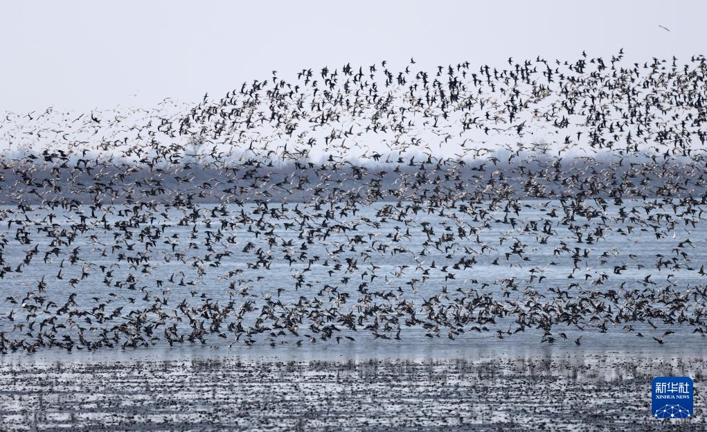 近日,辽宁丹东鸭绿江口候鸟栖息地候鸟翔集,形成“鸟浪”景观,吸引游客前来观赏。