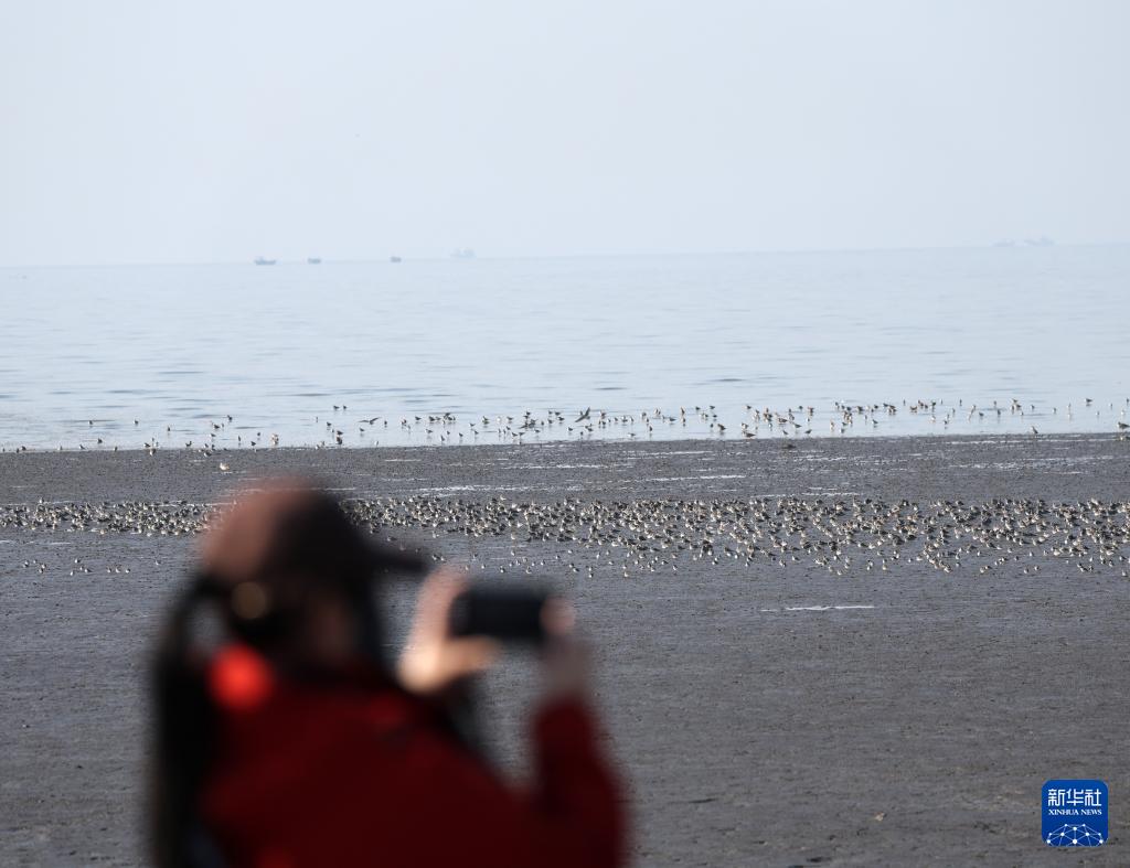 近日,辽宁丹东鸭绿江口候鸟栖息地候鸟翔集,形成“鸟浪”景观,吸引游客前来观赏。