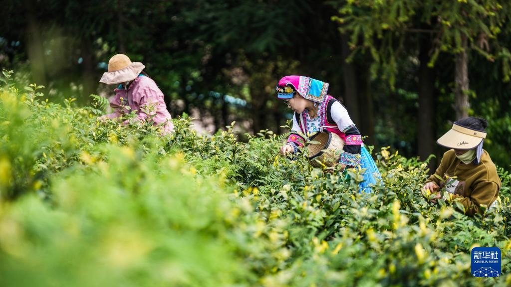 4月2日,茶农在六盘水市六枝特区月亮河彝族布依族苗族乡的茶山采摘春茶。
