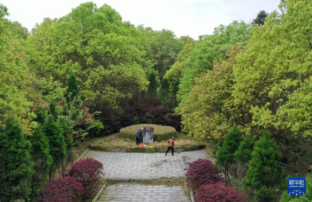 4月2日,在广西全州县米花山红军烈士墓,蒋石林老人(左)和老伴李桂英在给烈士墓打扫卫生(无人机照片)。蒋石林老人一家接续为红军烈士守墓扫墓92年的故事在当地传为佳话。