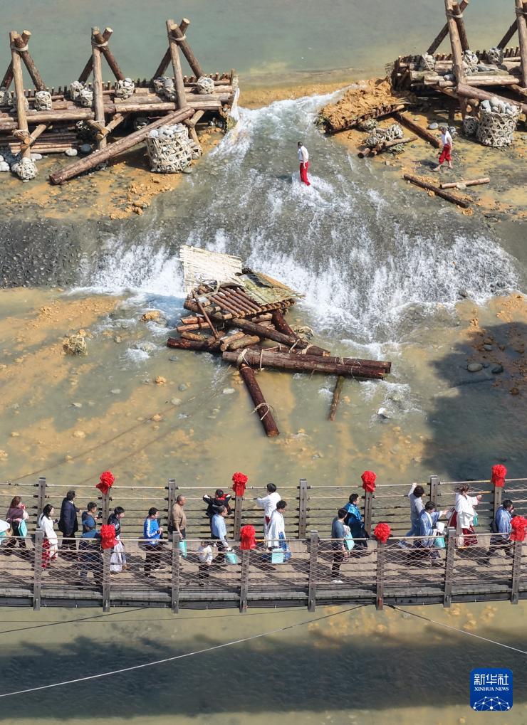 4月3日,在2026都江堰放水大典上,堰工砍断杩槎的绳索后,岷江水奔流而下(无人机照片)。