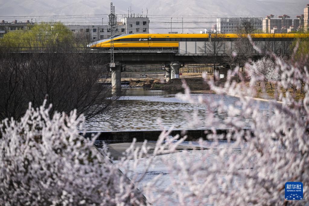 4月4日,在呼和浩特公主府公园附近,一列火车驶过。