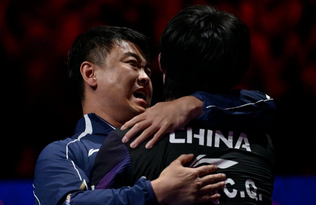 夺冠后,王楚钦躺倒在地,起身后拥抱了教练,并指了指背后球衣上的“CHINA(中国)”。
