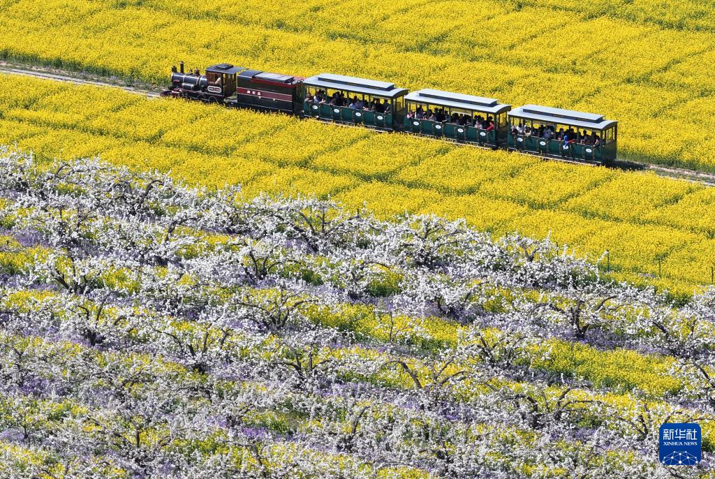 4月6日,游客乘观光小火车从河北省晋州市周家庄乡第九生产队梨园旁经过(无人机照片)。