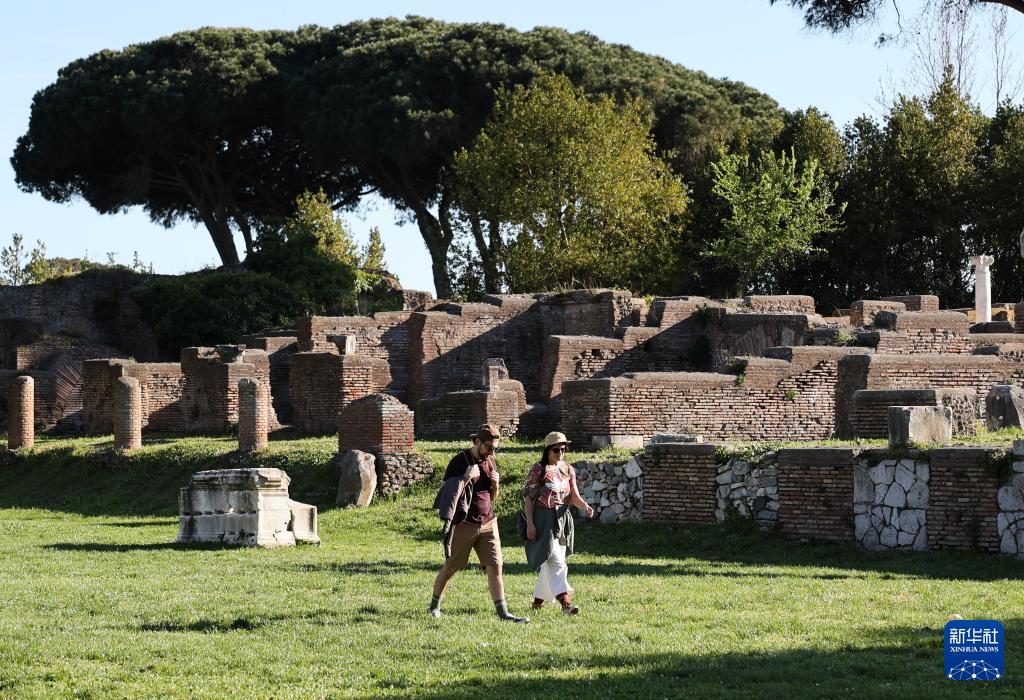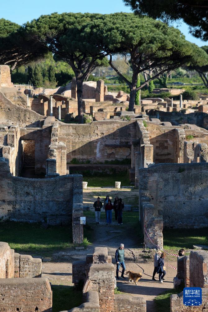 4月5日,游客在意大利罗马的奥斯蒂亚古城遗址游览。