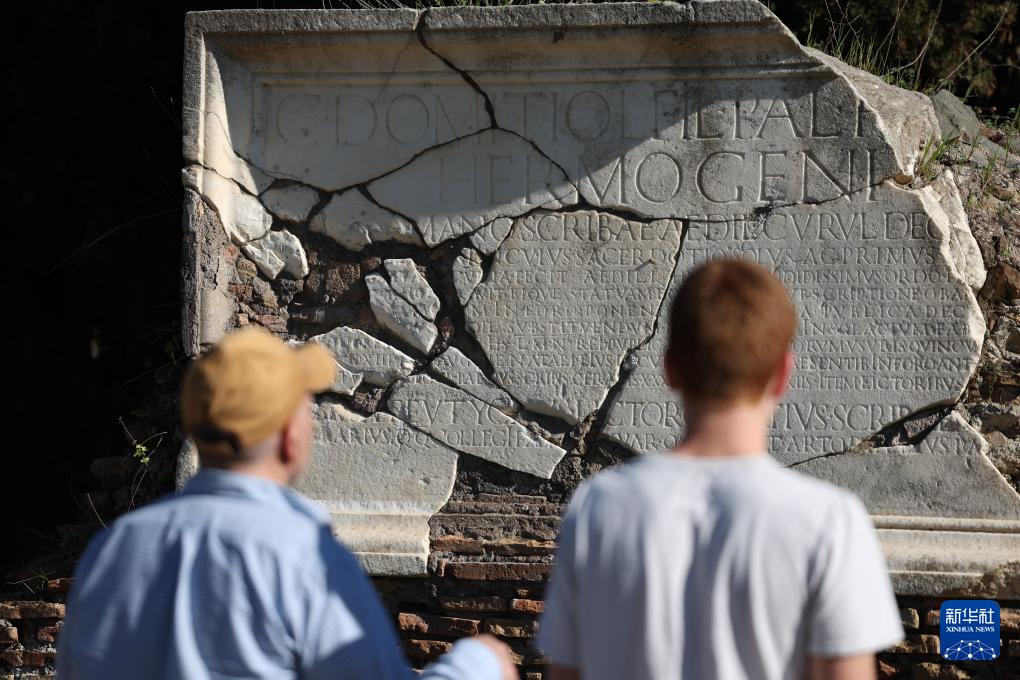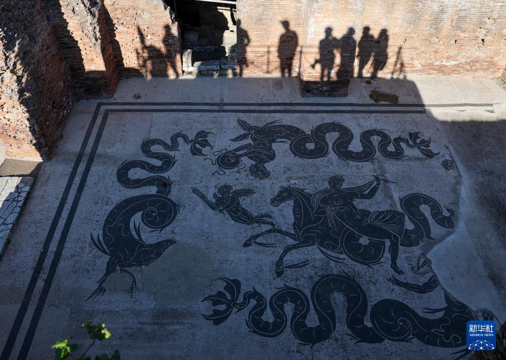 4月5日,在意大利罗马,游客在奥斯蒂亚古城遗址观看一处马赛克遗迹。