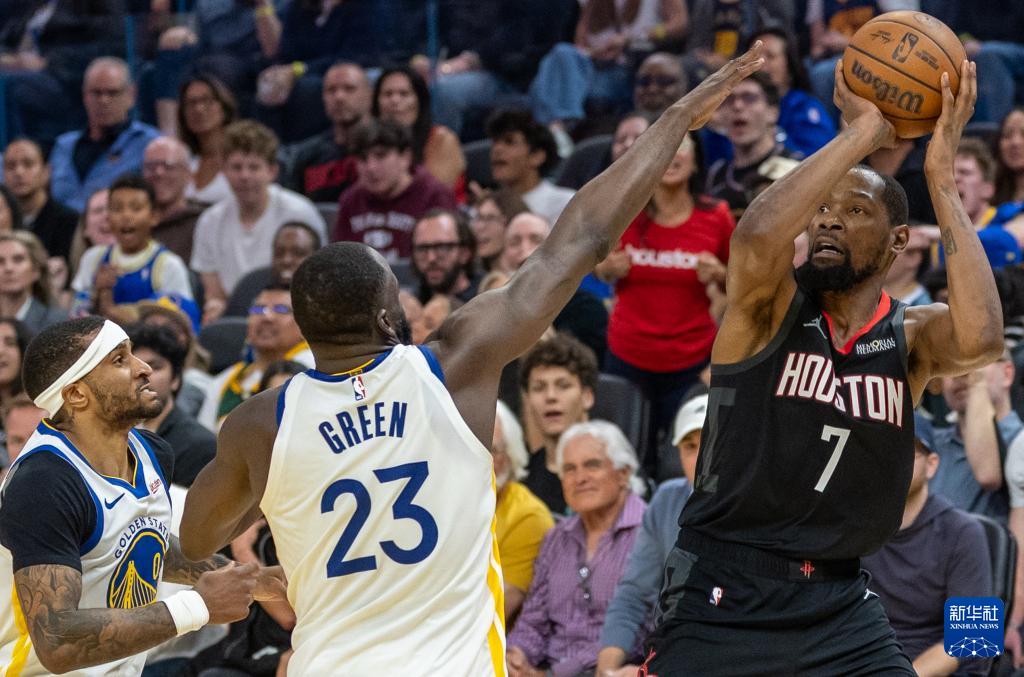 4月5日,火箭队球员杜兰特(左)在比赛中进攻。