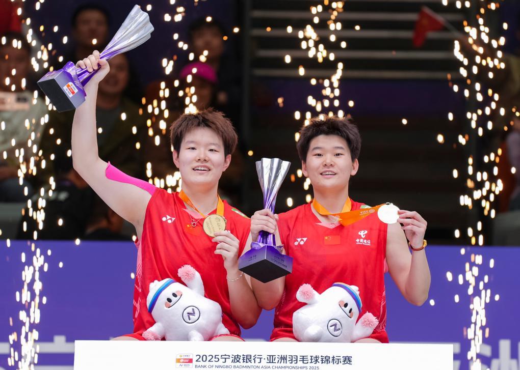 在2025亚洲羽毛球锦标赛女子双打决赛中,刘圣书(左)/谭宁夺得冠军。新华社记者 孙非 摄