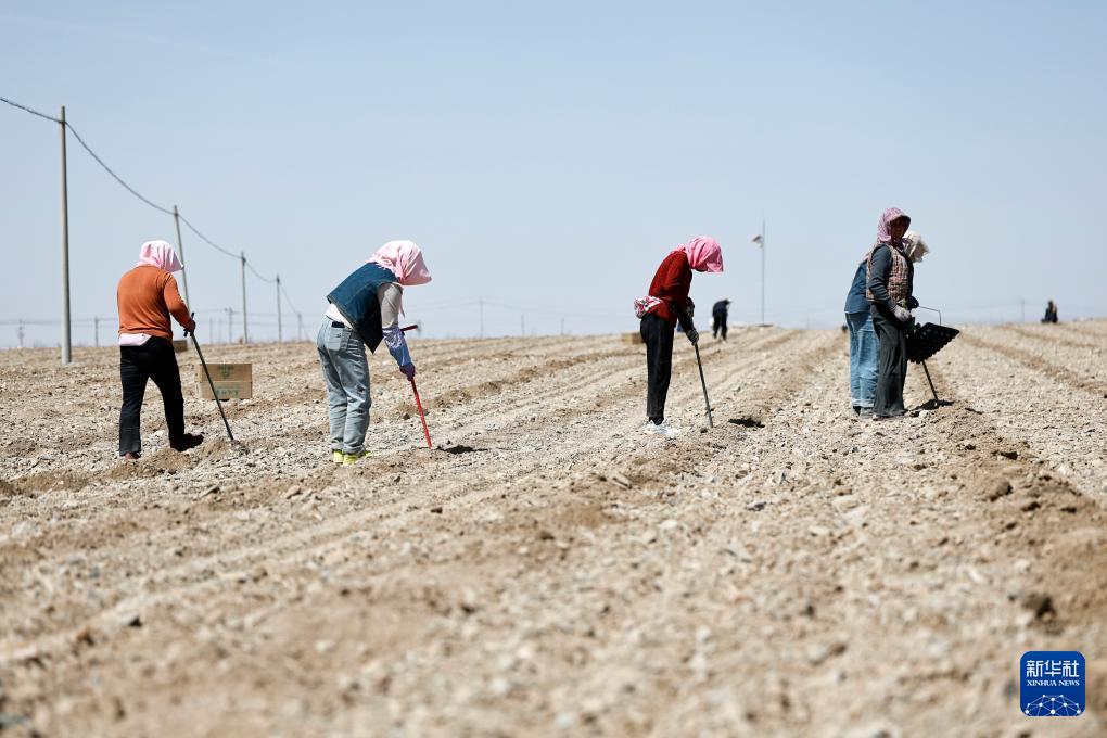 4月6日,宁夏中卫市沙坡头区兴仁镇,农户在田间种植硒砂瓜种苗。