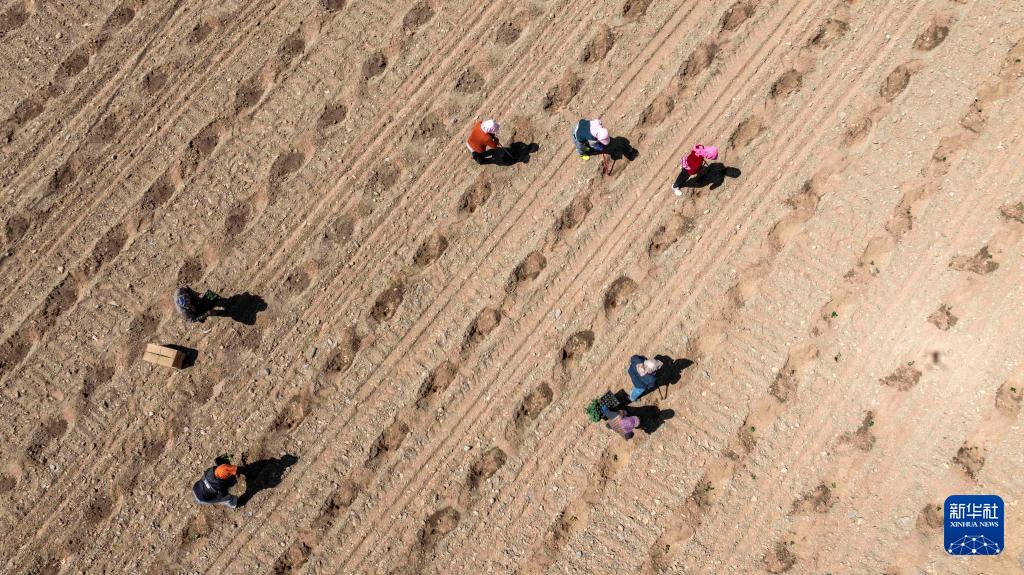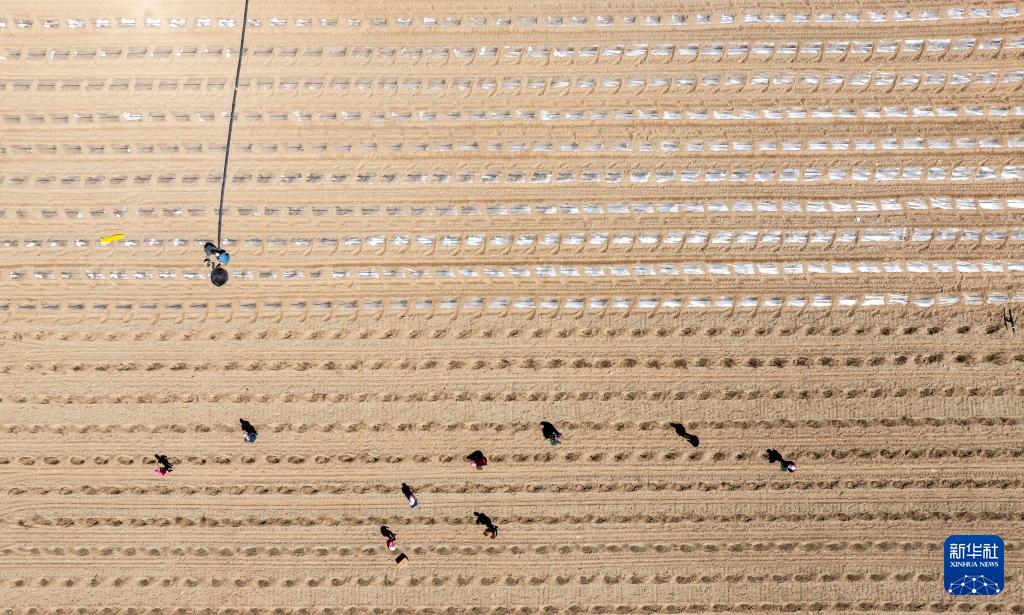 4月6日,宁夏中卫市沙坡头区兴仁镇,农户在田间种植硒砂瓜种苗(无人机照片)。
