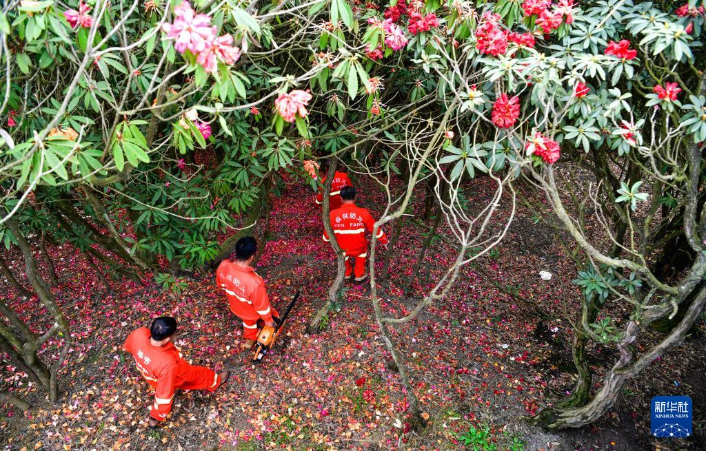 在贵州百里杜鹃管理区金坡景区,森林防火队员们在巡逻途中清理一棵倒伏的杜鹃树(4月2日摄)。