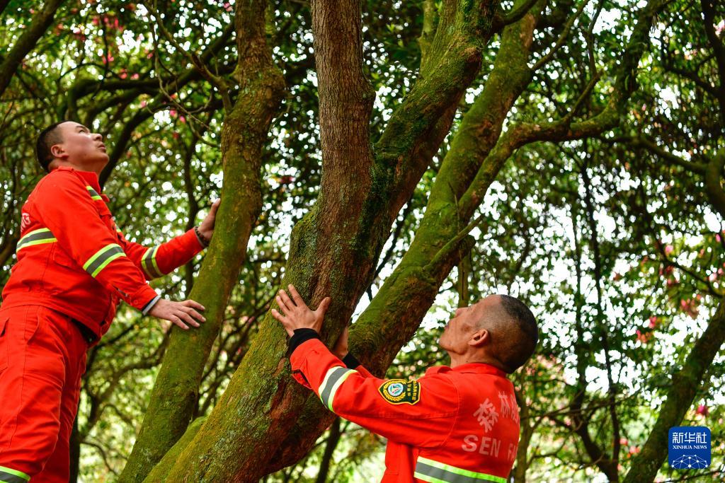 在贵州百里杜鹃管理区金坡景区,森林防火队员在查看一棵杜鹃树病虫害防治情况(4月2日摄)。
