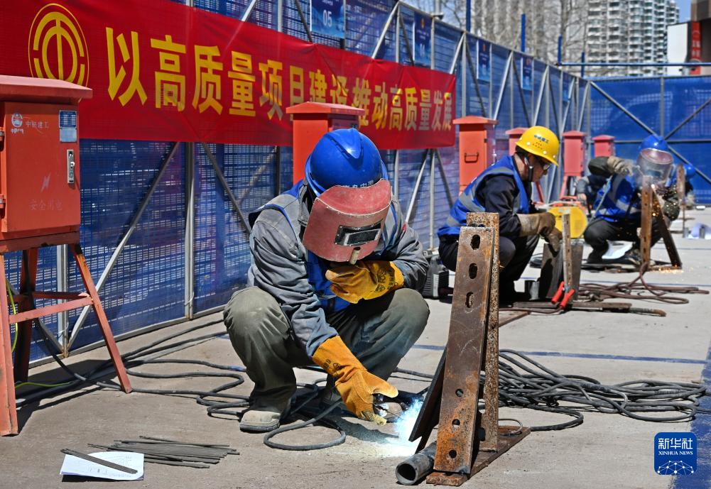 4月8日,在青岛市南京路1号项目比赛现场,选手参加电焊工个人赛。