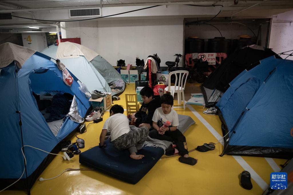 4月8日,在以色列特拉维夫一处地下防空设施,小朋友在临时搭建的帐篷间玩耍。新华社记者 陈君清 摄
