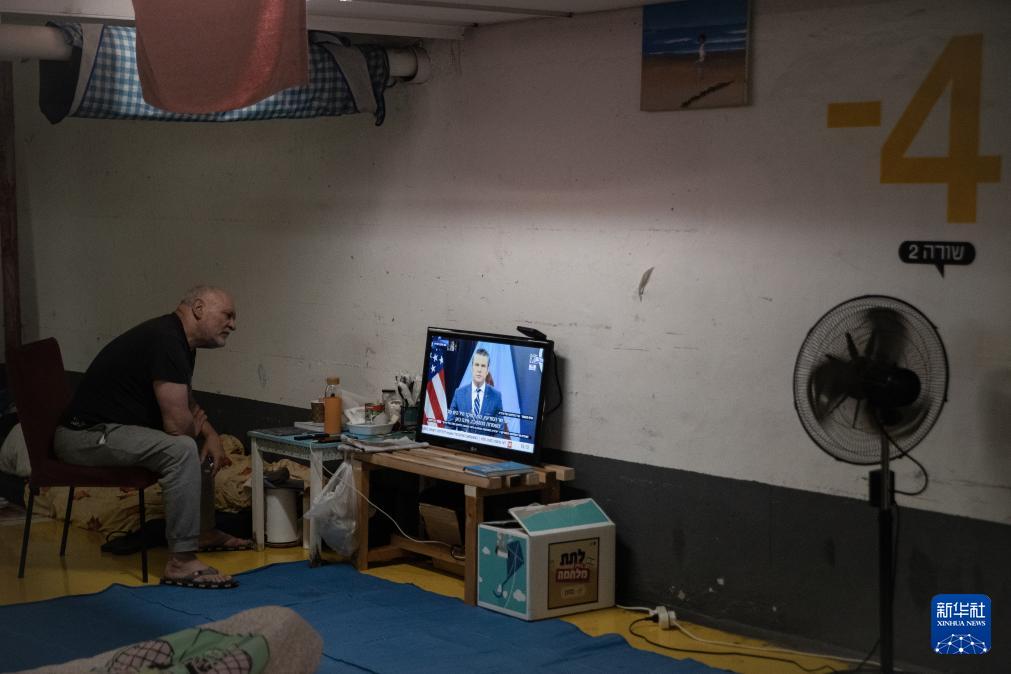 4月8日,一名男子在以色列特拉维夫一处地下防空设施收看新闻。新华社记者 陈君清 摄
