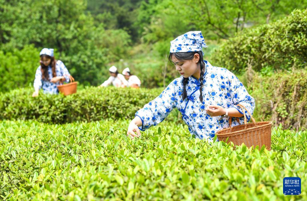 4月9日,茶农在青龙乡茶叶基地内采摘春茶。