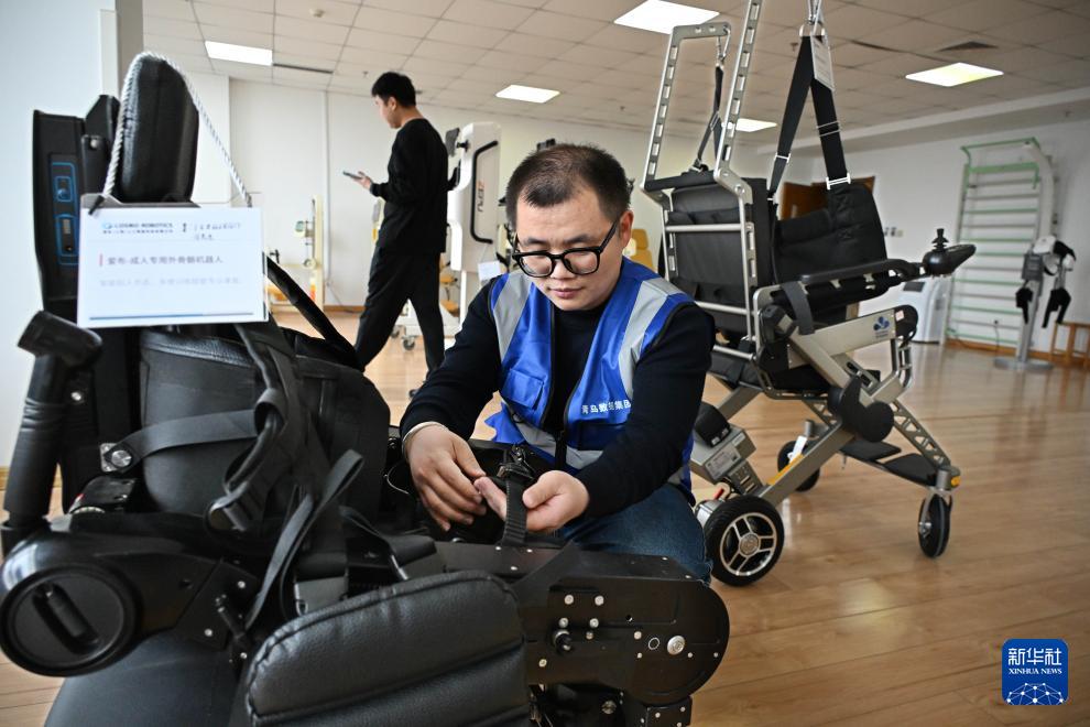 4月9日,在青岛市康养领域具身机器人暨智能康复类产品训练验证中心,工作人员准备对一台成人专用外骨骼机器人进行测试。