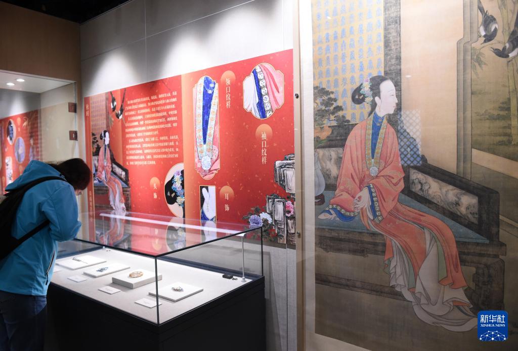 4月9日,游客在圆明园博物馆观看“屏影惊鸿 —— 雍正十二美人图岁时雅韵展”。
