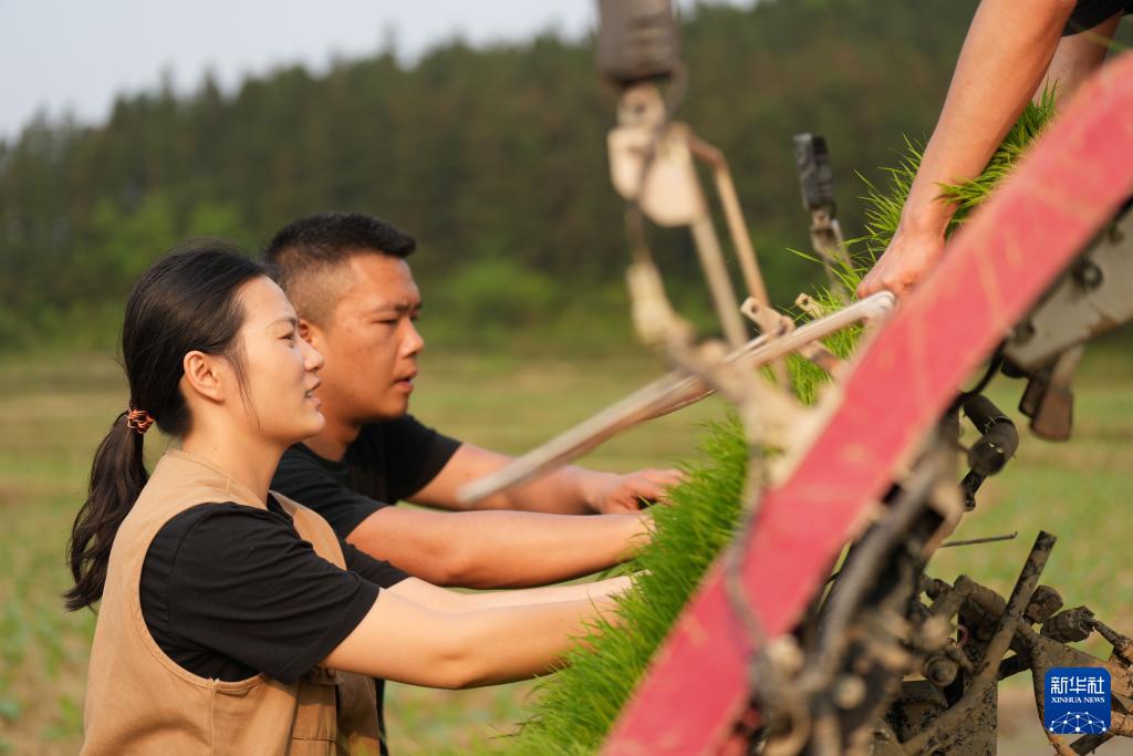 4月9日,骆雨和丈夫江茂智在田间为插秧机装载秧苗。