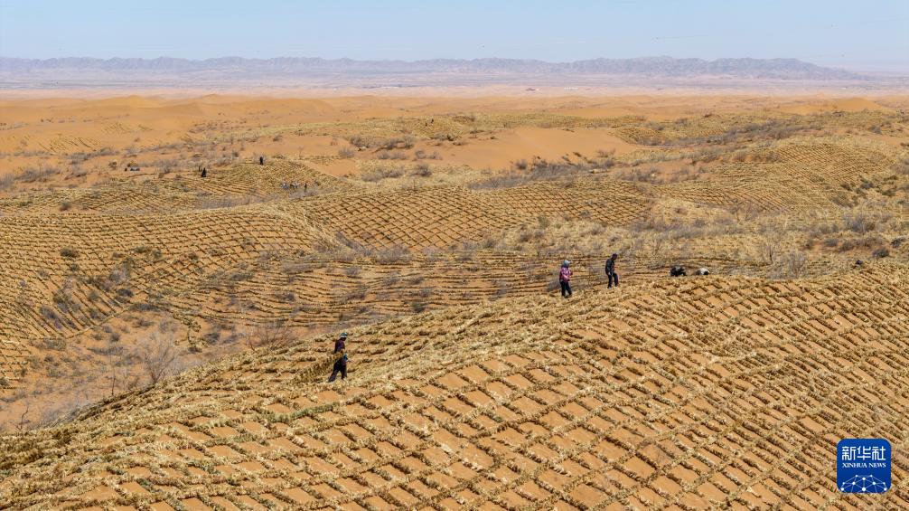 近日,宁夏中卫市组织治沙工人开展春季宁夏境内腾格里沙漠固沙锁边带改造提升工作,铺设新式草方格沙障,不断巩固治沙成果,筑牢黄河上游生态屏障。