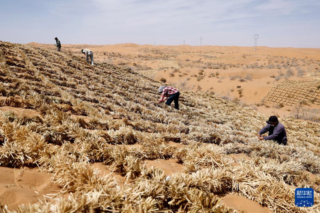 近日,宁夏中卫市组织治沙工人开展春季宁夏境内腾格里沙漠固沙锁边带改造提升工作,铺设新式草方格沙障,不断巩固治沙成果,筑牢黄河上游生态屏障。