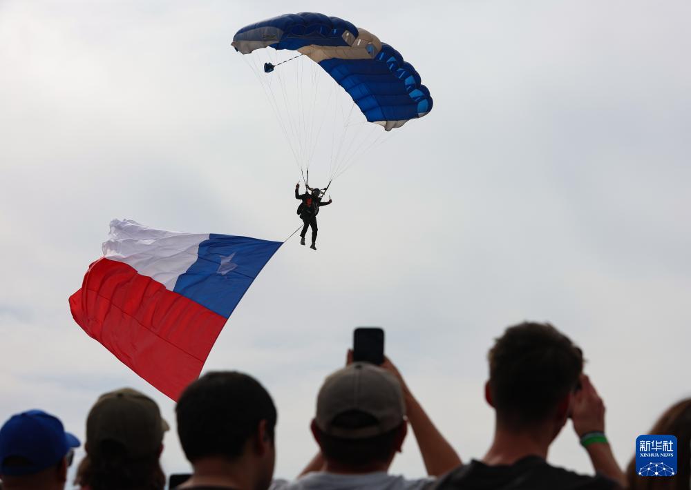 4月12日,人们在智利圣地亚哥首都大区普达韦尔举行的2026年国际航空航天展上观看跳伞表演。