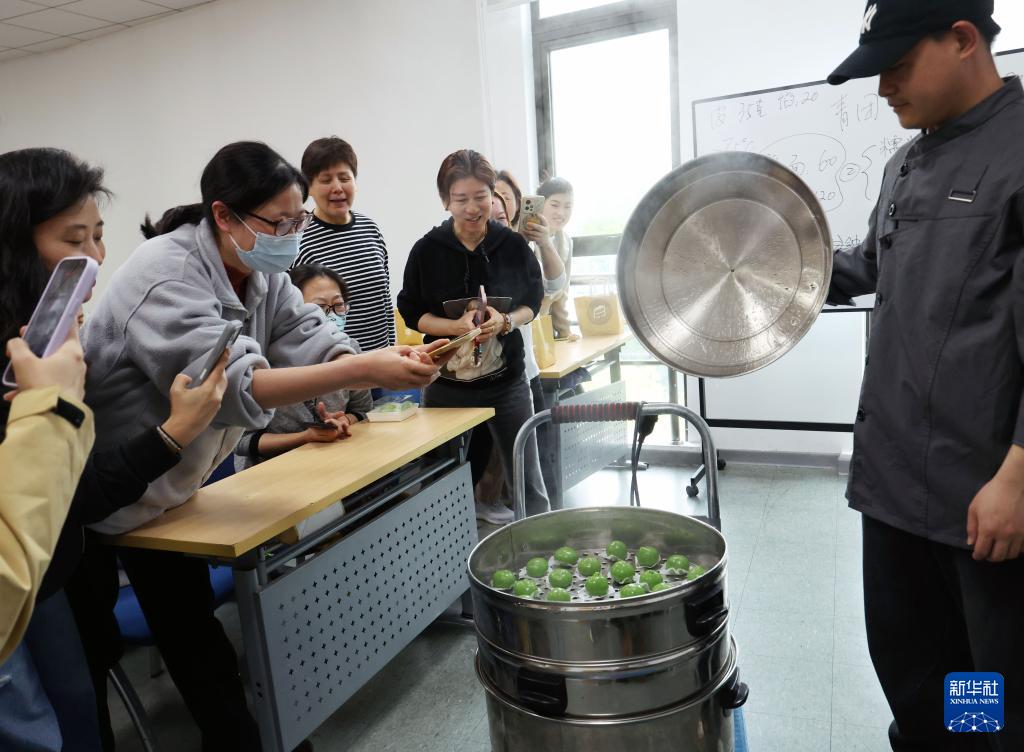 4月13日在上海市群众艺术馆拍摄的“中式点心”课的学员们制作的青团出锅。