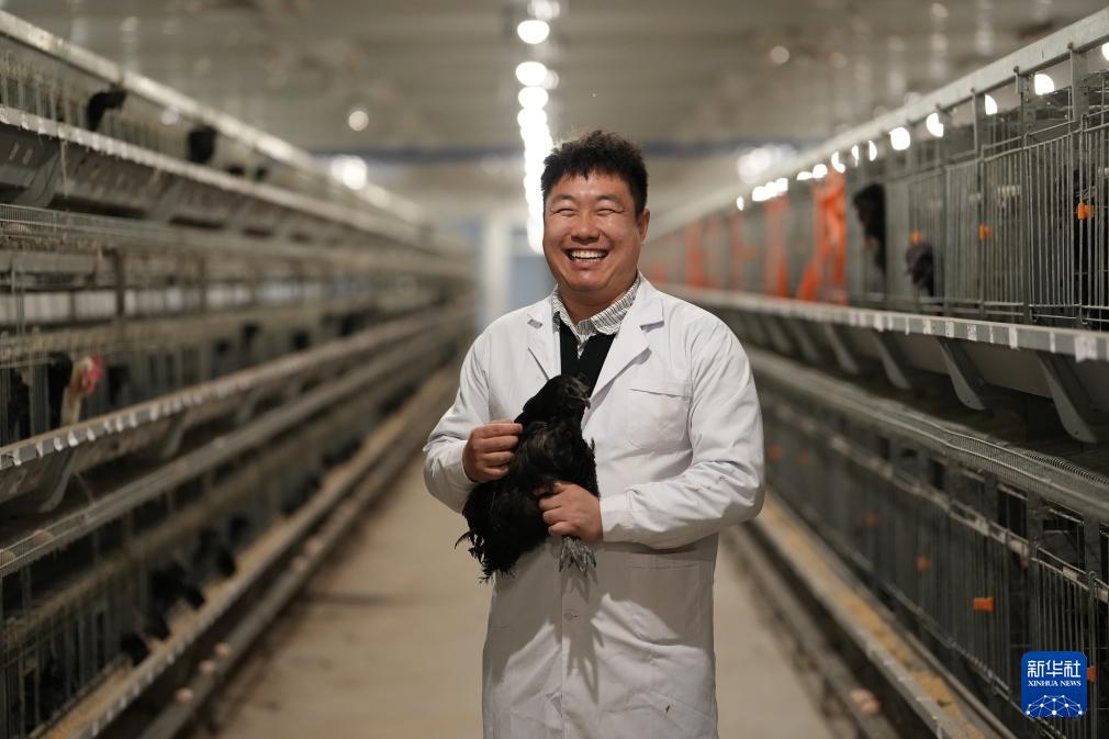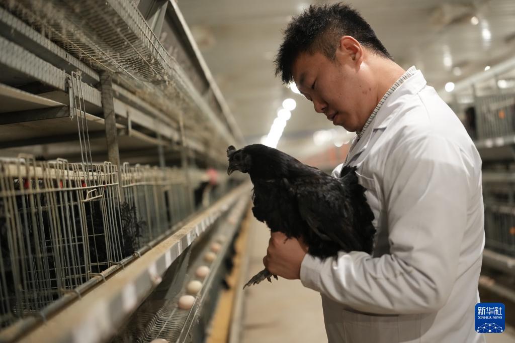 4月9日,西北农林科技大学博士研究生秦凯龙在陕西武功家禽科技小院养殖区内查看略阳乌鸡杂交后代成长情况。