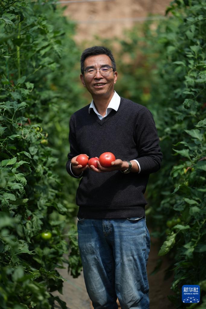 4月9日,陕西泾阳蔬菜科技小院首席专家、西北农林科技大学推广研究员张明科手捧普罗旺斯西红柿站在蔬菜大棚里。