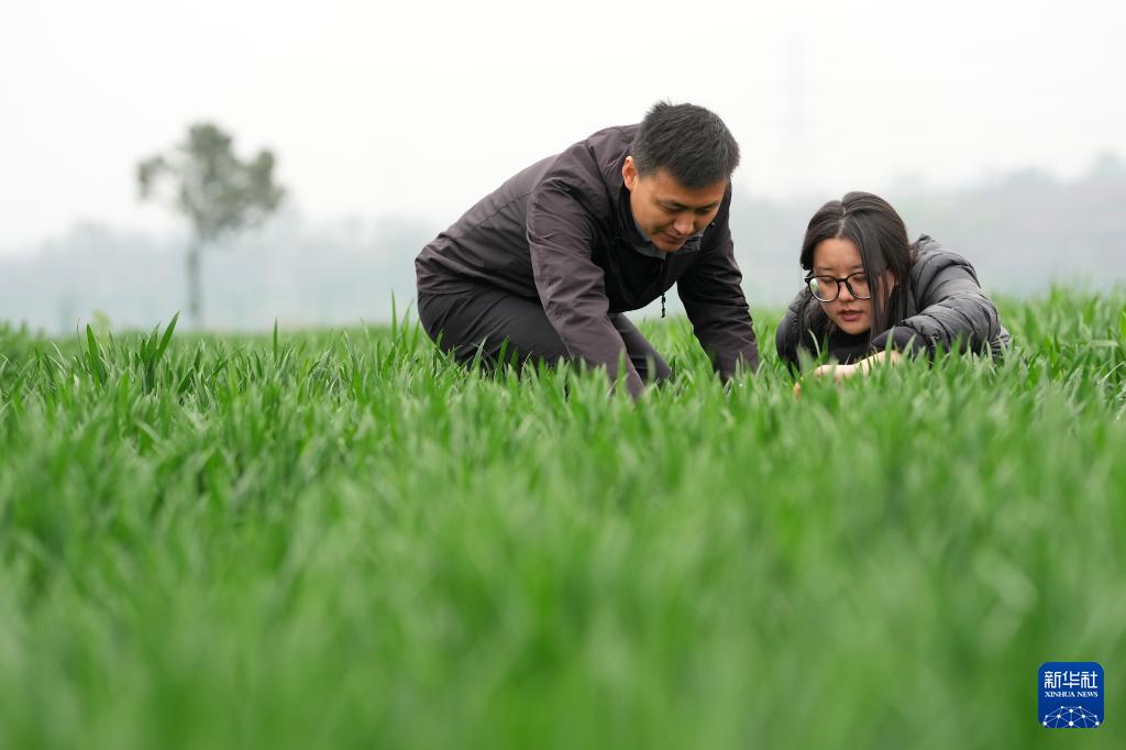 4月8日,陕西陇县小麦科技小院负责人、西北农林科技大学副教授张超(左)和硕士研究生张玉珍在试验田里查看小麦生长情况。