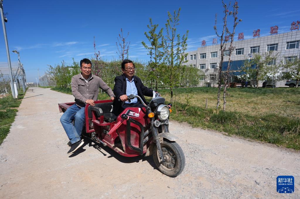 4月10日,延安洛川苹果试验示范站科技小院首席专家、西北农林科技大学教授马锋旺(右)和博士研究生魏江彤前往试验田。