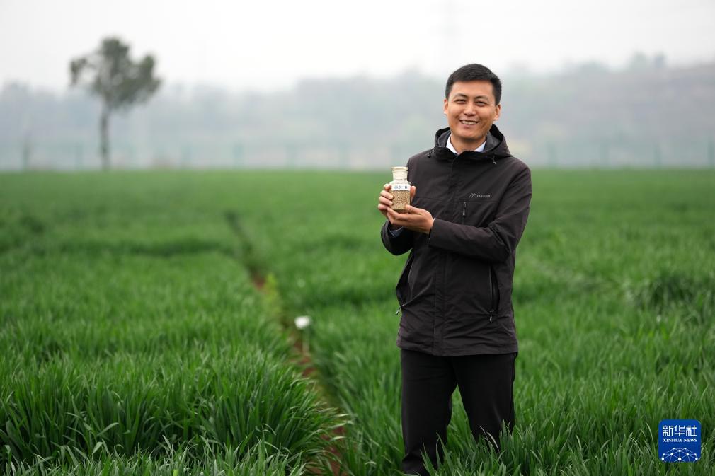 4月8日,陕西陇县小麦科技小院负责人、西北农林科技大学副教授张超手捧西农111小麦种子站在试验田里。