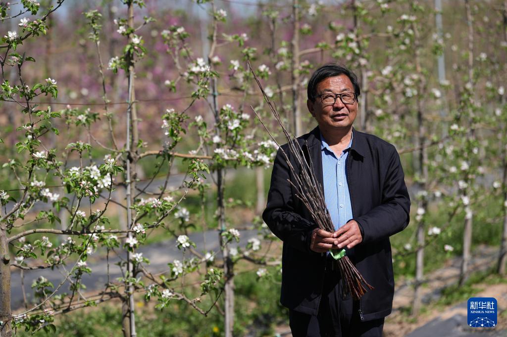 4月10日,延安洛川苹果试验示范站科技小院首席专家、西北农林科技大学教授马锋旺在苹果园里手捧“秦脆”苹果嫁接枝条。