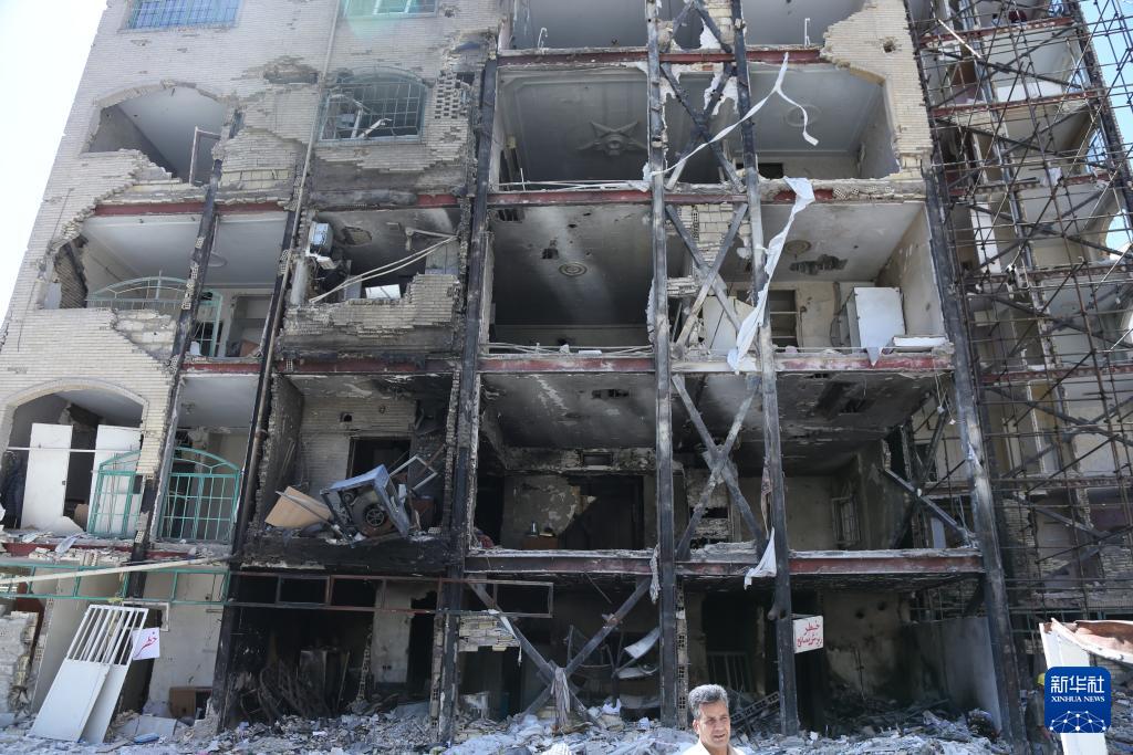 这是4月14日在伊朗首都德黑兰东南部一处居民区拍摄的遭美以袭击严重受损的楼房。美以袭击给居民区造成人员伤亡和严重财产损失,当地居民强烈谴责。