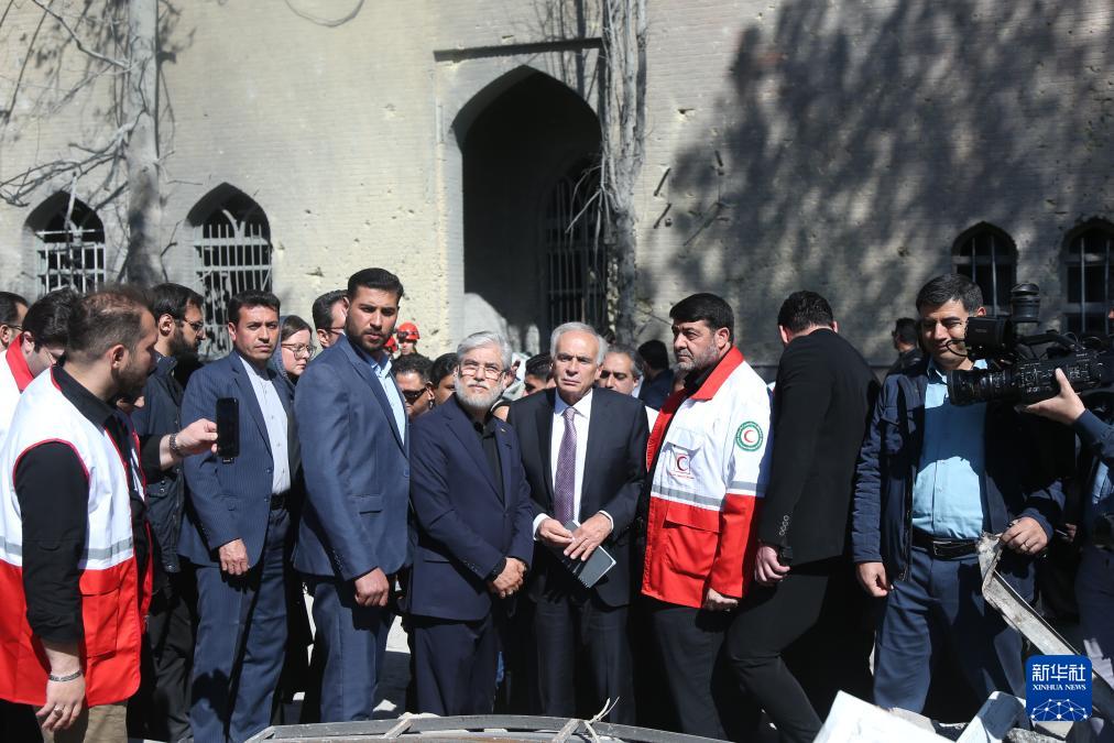 4月9日,在伊朗首都德黑兰,联合国秘书长个人特使让·阿尔诺(中)实地察看遭美以空袭的伊朗大学损毁现场。
