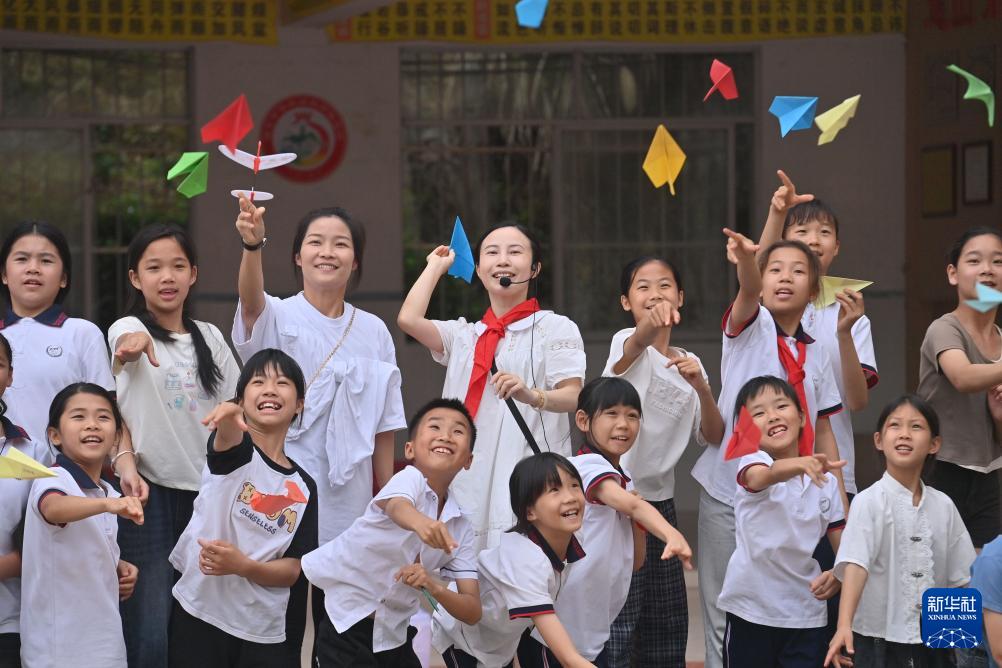 4月16日,在梧州市长洲区倒水镇大桥小学,送教老师和学生一起放纸飞机。